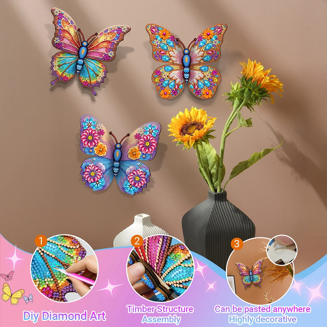 3D Wooden Diamond Art Butterfly Wall Decor Kit - DIY Sparkling Butterfly Craft for Home Decoration