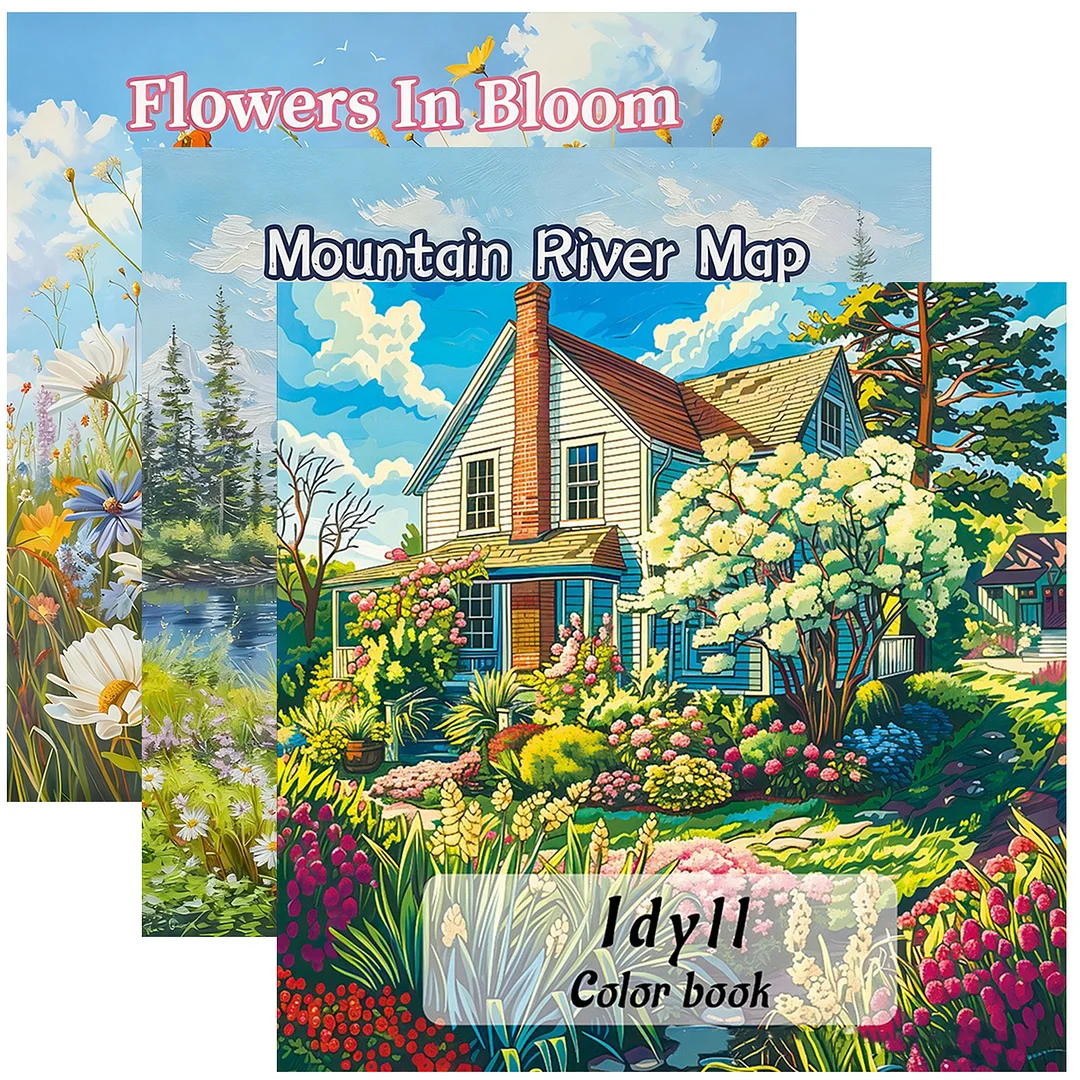 3PCS Scenery Coloring Book Set Mindfulness Art Books for Adults