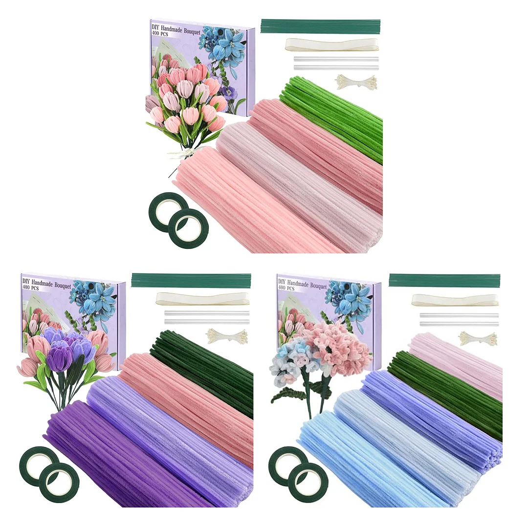 400 Pcs Chenille Stems Flowers Craft Kit with Floral Wires Tape Stamen and Ribbon Assorted Colors Pipe Cleaners Bulk Suitable for Home Decor Handmade Gifts