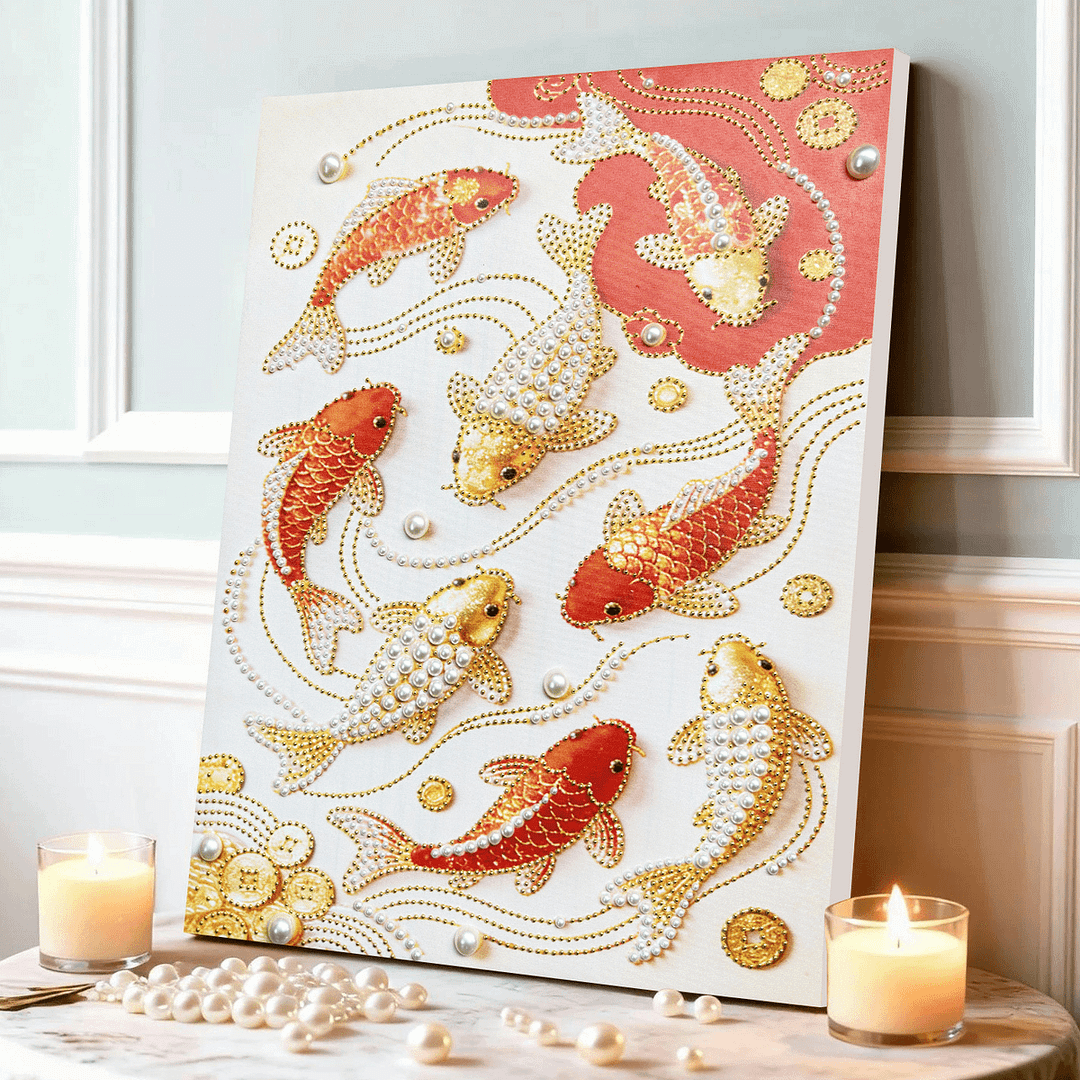 (40x50cm)DIY Pearl Painting Framed Koi Handmade Pearl Material Art Kit Living Room Decor