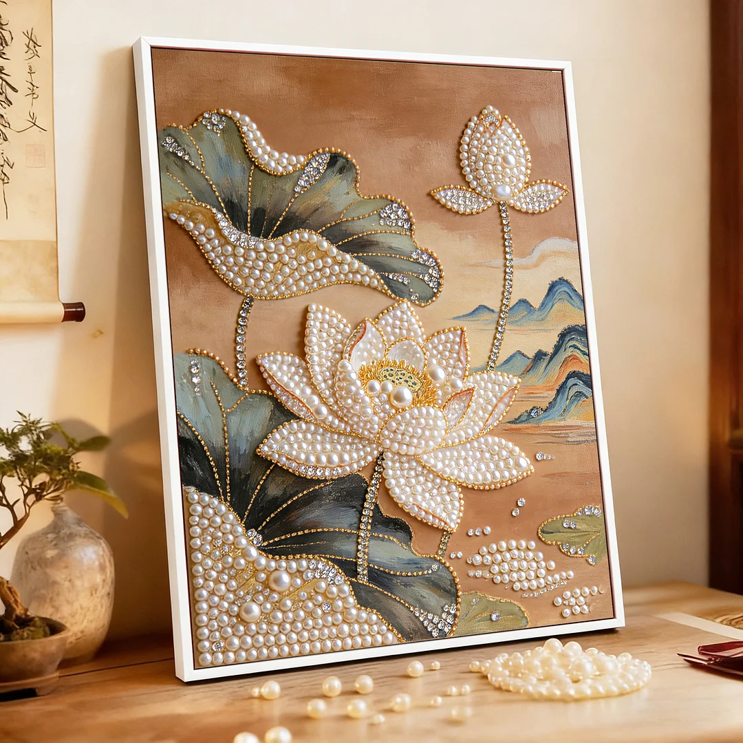 (40x50cm)DIY Pearl Painting Lotus Flower Framed Handmade Pearl Material Art Kit Living Room Decor