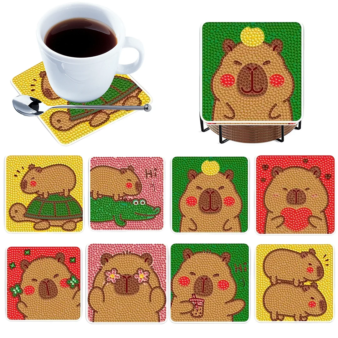 8pcs Cartoon DIY Diamond Painting Wooden Coasters Kits with Holder (Capybara)
